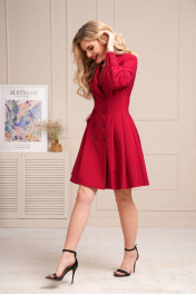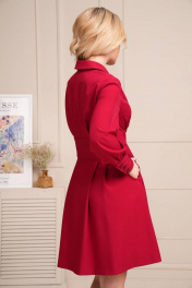 Платье приталенного силуэта со спущенной линией плеча на двубортной застежке. Воротник пиджачного типа с отложными лацканами. Нижняя часть платья расширенная со складками от линии талии, в боковых швах обработаны карманы. Притачной пояс спинки и полочек продекорирован рельефными швами. Полочки в области плеча со складками, идущими от шва притачивания кокеток. Рукава втачные по низу притачная широкая манжета с застежкой на петли и пуговицы. Длина рукава 60см, длина платья 94см.