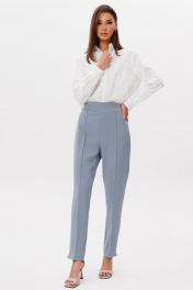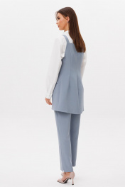 Стильный гармоничный комплект, состоящий из полуприлегающего жилета, брюк, слегка зауженных к низу и блузы рубашечного покроя. Жилет полуприлегающего силуэта на подкладе с классическими бретелями шириной 2,5 см. Спереди изделие имеет вертикальные рельефные детали для прилегания по фигуре, горизонтально расположены функциональные прорезные карманы с клапаном. Жилет имеет двубортную скрытую застежку на кнопочные элементы. Спинка со средним швом, талиевыми вертикальными вытачками. Изделие имеет фигурную линию низа: спинка ниже передней части на 6,5 см. Длина изделия по среднему шву спинки 70 см (высота бретели дополнительно 12 см). Длина передней части вместе с бретелью 76 см; жилет дополнен съемным текстильным поясом, шириной 3 см, в котором расположена застежка: петля/пуговица (+ дополнительно 2 петли на объем талии). Брюки полуоблегающего силуэта, слегка заужены к низу. На линии талии: талиевые вытачки. В боковых швах по низу изделия: миниатюрные разрезы 3 см. На передних полотнищах брюк проложена вертикальная декоративная строчка с защипом 0,3 мм. Линия талии в изделии завышена на 2-3 см. Пояс состоит из фигурных деталей спереди, имитирующий корсет. На спинке в деталь пояса вложена для свободы движения эластичная тесьма (резинка). На поясе расположены шлевочные держатели, при желании можно в них вставить ремень. Застежка на потайную молнию расположена в левом боковом шве, также в поясе на петли/пуговицы. Высота пояса на полочке 6,5 см, по спинке 4,5 см. Длина брюк по боковому шву от верхней точки пояса 97 см. Блуза комплекта рубашечного покроя с втачным одношовным рукавом с манжетой. Спинка изделия состоит из горизонтальной кокетки и основной детали, на которой расположены две складки для свободы движения. Линия низа: фигурная. Рукав втачной, одношовный, с притачной манжетой, высотой 5,5 см и разрезом-планкой для петли/ пуговицы. Высота планки 11 см. Длина рукава в готовом виде 61 см. Горловина оформлена стойкой и рубашечным воротником. Застежка вертикальная на планках петли/пуговицы. Длина блузы по спинке 74-76 см (в зависимости от размерного ряда). (фурнитура может отличаться от представленной на рекламном фотоматериале) Особые рекомендации: рекомендуется холодная деликатная ручная стирка, без использования отбеливающих СМС, без интенсивного трения. Сушка в вертикальном положении. ВТО с минимальным паром.