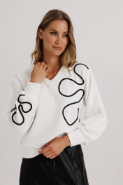 Эффектный элегантный блузон с контрастным кантом. Блузон из уютного трикотажного полотна, свободного прямого силуэта. Линия плеча чуть спущена, рукав прямой на зауженной манжете. Длина рукава вместе с плечевой линией 78 см. Из них 13 см: длина плеча и 65 см: длина рукава с напуском. Высота манжета 8 см. Декоративным элементом блузона выступает контрастный рисунок, напоминающий элементы лепестков цветочного узора. Расположены эти элементы ассиметрично, на одном из рукавов, также полочке и частично в боковом сегменте спинки блузона. Рисунок создан трикотажным кантом. Горловина оформлена угловым вырезом на полочке и оформлена притачным обтачным элементом. Низ блузона оканчивается притачной манжетой, высотой 7,5 см. Длина блузона по спинке изделия 61 см. (фурнитура может отличаться от представленной на рекламном фотоматериале)