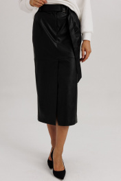 Блузон из уютного трикотажного полотна, свободного прямого силуэта. Рукав реглан, полноценной длины на манжете. Длина рукава вместе с плечевой линией 68 см. Из них высота манжета 7 см. Спинка изделия со средним швом, в котором располагается застежка-молния. Низ блузона оканчивается притачной манжетой, высотой 6 см. Длина блузона по спинке изделия 56 см. Горловина оформлена стойкой-лодочкой, высотой 4 см. Отдельным декоративным элементом выступает съемная брошь-цветок. Юбка выполнена из эко-кожи прямого силуэта. Спереди: центральный разрез-шлица, высотой 46 см. Также, в центральном шве расположена застежка на молнию. Также юбка имеет горизонтальные линии с декоративной строчкой, высота кокетки 34 см. Линия талии обработана притачным поясом со шлевочными держателями. В боковых сегментах пояса вставлена эластичная тесьма для дополнительного регулирования объема талии. Высота пояса 4.5 см. Застежка в поясе на две функциональные петли/пуговицы. На линии талии расположены таливые вытачки. В боковых швах: наклонные карманы. Дополнительно в шлевочные отверстия вставлен текстильный пояс с пряжкой. Длина изделия юбки 80 см.