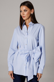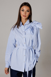 - ОписаниеБлуза рубашечного покроя с втачным одношовным рукавом с манжетой. Спинка изделия состоит из горизонтальной кокетки и основной детали, на которой расположены две складки для свободы движения. Линия низа: фигурная. Рукав втачной, одношовный, с притачной манжетой, высотой 5,5 см и разрезом-планкой для петли/пуговицы. Высота планки 11 см. Длина рукава в готовом виде 61 см. Горловина оформлена стойкой с рубашечным воротником. Застежка вертикальная на планках петли/пуговицы. Длина блузы по спинке 74-76 см (в зависимости от размерного ряда). Также присутствует съемные текстильные дополнения: пояс и декоративная брошь в виде банта.
