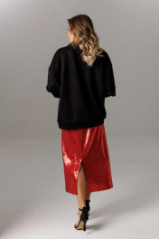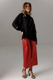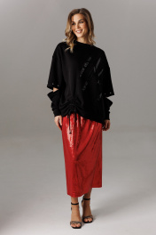 Блузон из трикотажного полотна, свободного прямого силуэта. Линия плеча спущена, рукав прямой, на зауженной манжете. Линия плеча состоит из притачного элемента: погона. Рукав основной состоит из двух деталей, в горизонтальном шве стачивания данных деталей расположен открытый разрез. По верхнему срезу расположены стразы. При желании длина рукава может трансформироваться и отверстием выступает открытый разрез. Длина рукава, вместе с плечевой линией 75 см. Из них 13 см длина плеча и 62 см длина рукава. Высота манжета 5 см. На центральной части переда блузона расположены декоративные аппликационные элементы, в виде ассиметричных полос из пайеток. Горловина округлая, оформлена притачной планкой, высотой 3 см. Низ блузона оканчивается притачной манжетой, высотой 6 см. Длина блузона по спинке изделия 70 см. Конструктивным элементом является вертикальная ассиметричная шнуровка для изменения низа свитшота. Юбка из трикотажного полотна с пайетками, прямого свободного силуэта, на трикотажной подкладке. Линия талии оформлена притачным поясом на эластичной тесьме. Длина юбки по среднему шву спинки 78 см. (фурнитура может отличаться от представленной на рекламном фотоматериале)