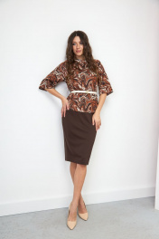 Стильный комплект, состоящий из блузона и юбки. Блузон прилегающего силуэта, слегка расклешён к низу. По полочке – нагрудная вытачка. В среднем шве спинки – потайная застёжка-молния. Горловина обработана стойкой-воронкой высотой 4,5см. Длина блузона по спинке от стойки – 54 см. Рукав – реглан, слегка расклешён к низу, длиной – 42,5 см. Юбка на подкладке, зауженная к низу, по среднему шву – потайная застёжка на тесьму – молнию, в низу – разрез. Верхний край обработан обтачкой. Длина юбки по боковому шву – 64 см. Цвет комплекта может отличаться на полутон от заявленного на фото. Декор: съёмный пояс, может отличаться от заявленного на фото.