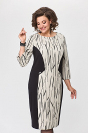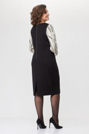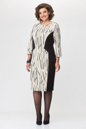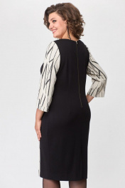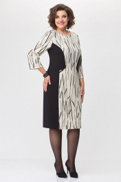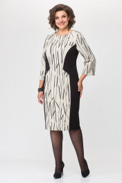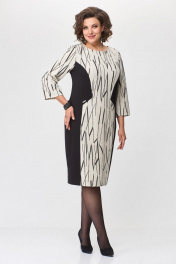 Платье женское полуприлегающего силуэта . Вырез горловины округлый, рукав втачной умеренно расширенный к низу. По переду платье офрмлено декоративными подрезами с комбинированием двух тканей. По спинке в среднем шве застежка на тесьму-молнию и разрез.