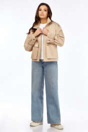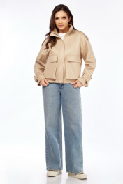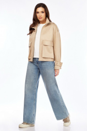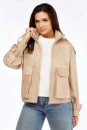 Жакет женский прямого силуэта, свободного кроя, слегка укороченный. Выполнен из костюмно-плательной ткани . Жакет на подкладке. По горловине обработана стойка. Застёжка центральная на тесьму "молния"под планкой. Пройма спущенная, рукава длинные. По низу рукавов выполнены съёмные хлястики, застёгивающиеся на пряжку и продетые через шлёвки. В области плечей пришиты декоративные паты с пуговицами.Спереди настрочены функциональные карманы с клапанами. Длина жакета- 56 см, длина рукава- 63 см.