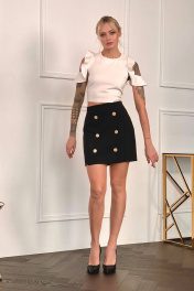 Топ женский из плотного трикотажа прилегающего силуэта с воланами на плечевых срезах. Разъемная молния по спинке топа. Длина топа 37 см