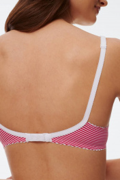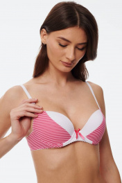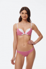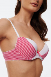 Бюстгальтер из эластичного трикотажного волокна (микрофибра). Формованная чашка минимальный эффект («пуш-ап») каплевидной формы, расположенный в нижней части чашки. В модели присутствуют каркасы («косточки»). В качестве декоративного элемента присутствует маленький бантик спереди по центру изделия. Бретель шириной 1,0 см скомбинирована с ажурной бретелью. Застежка на крючки и петли 1х2 или 1х3.