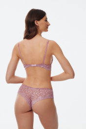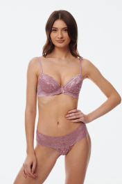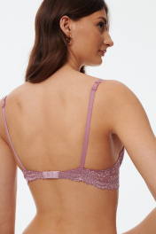 Бюстгальтер на дублированной основе (тонкий поролон) внутри хлопок. Полностью выполнен из эластичного кружева. В модели присутствуют каркасы («косточки»). Бретели регулируются по длине, но не отстёгиваются.