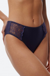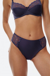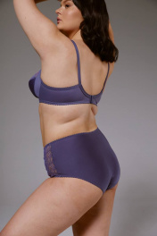 Полноразмерные трусы слипы с высокой линией талии (закрывают пупок), выполненные из эластичного трикотажного полотна (микрофибра) и декорированные вставками из кружева по бокам. Подкладка ластовицы из 100% х/б.