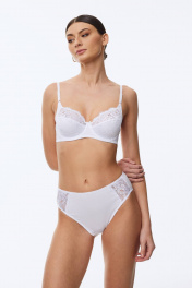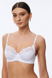 Бюстгальтер с мягкой чашкой, выполненный из эластичного трикотажного полотна и декорированный эластичным кружевом по всей чашке. Внутри чашки хлопок. В модели присутствуют каркасы («косточки»). Ширина бретелей увеличивается пропорционально увеличению размера.