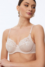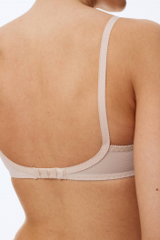 Бюстгальтер с мягкой чашкой, выполненный из эластичного трикотажного полотна и декорированный эластичным кружевом по всей чашке. Внутри - вставка из хлопка. Ширина бретелей увеличивается пропорционально увеличению размера.