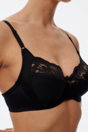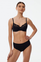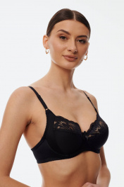 Бюстгальтер с мягкой чашкой, выполненный из эластичного трикотажного полотна и декорированный эластичным кружевом в верхней части чашки. Есть боковая поддерживающая деталь, обеспечивающая дополнительное приподнимание груди. В модели присутствуют каркасы ("косточки"). Бретели регулируются по длине. Ширина бретелей увеличивается пропорционально увеличению размера.
