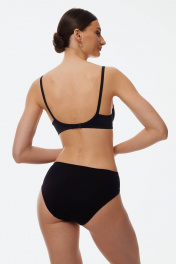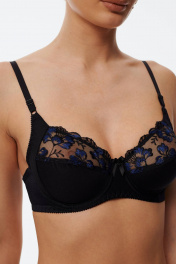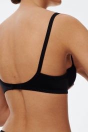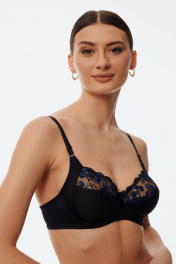 Бюстгальтер с мягкой чашкой, выполненный из эластичного трикотажного полотна и декорированный вышивкой. Есть боковая поддерживающая деталь, обеспечивающая дополнительное приподнимание груди. В модели присутствуют каркасы ("косточки"). Бретели регулируются по длине. Ширина бретелей увеличивается пропорционально увеличению размера (1,0 см, 1,5 см, 2,0 см, 2,5 см).