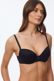 Бюстгальтер с формованной чашкой (эффект двойного «пуш-ап») на косточках, которые усиливают поддержку, приподнимая грудь, делая ее более полной и округлой. Выполнен полностью из эластичного трикотажного полотна. В качестве декоративного элемента присутствует маленький бантик спереди по центру изделия.