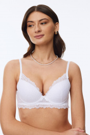 Бюстгальтер с формованной чашкой (минимальный эффект «пуш-ап») и удлинённым кружевным станом, декорированный эластичным кружевом по всей чашке. В модели присутствуют каркасы («косточки»). Широкие кружевные бочки укреплённые пластиной. Бретели регулируются по длине.