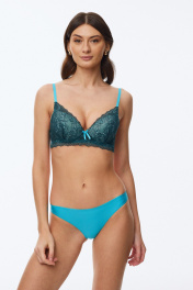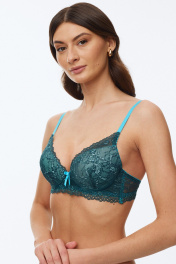 Бюстгальтер с формованной чашкой (минимальный эффект «пуш-ап») и удлиненным кружевным станом, декорированный эластичным кружевом по всей чашке; в модели присутствуют каркасы. Бочки широкие и укреплены пластиной, что обеспечивает надежную защиту от заворачивания бочков. Бретели регулируются по длине