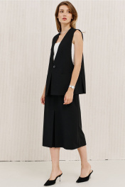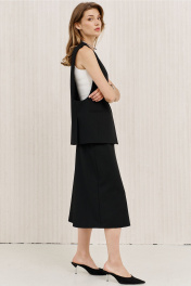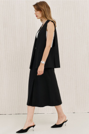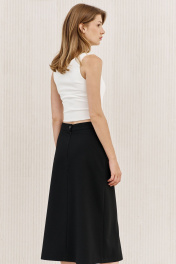 Юбка А-силуэта, на подкладке, длиной ниже линии колена на притачном прямом поясе. Застежка на потайную тесьму молнию в среднем шве заднего полотнища юбки и пуговицу и петлю. Перед со встречной складкой.