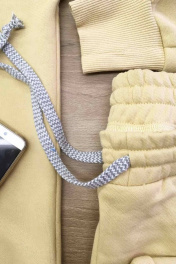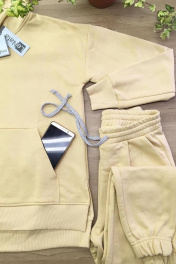 Комплект женский, 2-х предметный, состоящий из джемпера (худи) и брюк. Худи прямого силуэта, с капюшоном, со спущенной линией плеча и накладным фигурным карманом-«кенгуру». Низ изделия асимметричный-перед короче, а спинка длиннее. Низ худи и низ рукава обработан притачной планкой и манжетой из отделочного довяза в цвет основного материала. В боковых швах имеются разрезы. Брюки на притачном поясе с резинкой по кругу. Задняя половинка брюк без конструктивных особенностей. Передняя половинка брюк с боковыми карманами- хулиганами и декоративной складкой . В среднем шве передней половинки брюк – имитация застежки. Низ брюк присборен резинкой-имитация манжета.