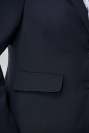 Комплект женский состоящий из жакета, блузы и брюк. Жакет полуприлегающего силуэта на подкладке. По переду декоративные вытачки, рельефы и функциональные прорезные карманы с клапаном. Воротник пиджачного типа с застежкой на 1 обтяжную пуговицу в рр.44-48. В размерах 50-54 жакет застегивается на 2 пуговицы. Рукав длинный, втачной. Все швы отдекорированы отделочной строчкой-имитация ручного стежка. Блуза женская полуприлегающего силуэта со сборкой по горловине и V-образным вырезом. Рукав короткий втачной. По горловине декоративная планка переходящая в завязку-бант. Брюки чуть заужены к низу, с функциональными карманами по переду. На притачном поясе имеется также отделочная строчка-имитация ручного стежка. Брюки застегиваются на петлю и обтяжную пуговицу.