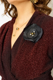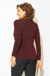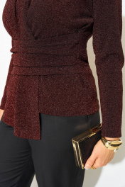 Эффектная нарядная блузка, выполнена из мягкого трикотажа с мерцающим эффектом. Такой дизайн ткани придает необычное переплетение нитей: с изнанки мягкий однотонный трикотаж! Вырез горловины мягкая стойка, переходящая в V-образный вырез с имитацией запаха. По полочке заложены декоративные складки для комфортного прилегания изделия. Низ блузки ассиметричный. Пояс декорирован задрапированным поясом из основной ткани, что зрительно стройнит и скрывает все недостатки фигуры. Рукав в точной, длинный. Спинка приталенная, без особенностей. К блузке предусмотрен съемная брошь, в виде цветка. Отлично сочетается с базовыми однотонными брюками из коллекции Лилиана. Длина по спинке – 63 см, рукав – 62 см. По переду – 74 см.
