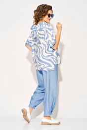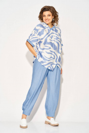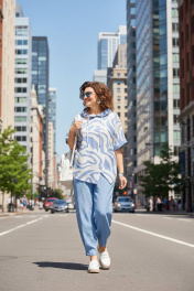 Стильный летний костюм, состоящий из удлиненной туники свободного покроя и брюк. Оригинальная туника из вискозы добавлением льна. Модель с цельнокроеным укороченным рукавом и ассиметричным подрезом по полочке. Модель с легким капюшоном и кулисой на шнуровке. Низ изделия разноуровневый. Спинка цельная. В комплекте свободные брючки, завышенной посадки. Брюки на притачном поясе с круговой резинкой. Имеются боковые карманы. Низ с заложенными складками, что придает изделию более спортивный образ. Длина туники по спинке - 68 см, рукав – около 30 см. Брюки – 98-100 см.