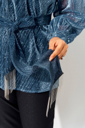 Трендовая блузка из легкой сетчатой ткани c эффектом мерцания станет стильным дополнением вашего гардероба. Ее можно комбинировать с различными элементами гардероба, накинуть поверх платья или топа. Модель выполнена с воротником-стойкой, который добавляет элегантности образу. Застежка центральная на петли и пуговицы. По бокам расположены разрезы. Свободный крой обеспечивает комфорт и подчеркивает женственность. Длинный рукав с манжетами делает ее универсальной для любого сезона, а удлиненный силуэт добавляет изысканности. В комплект входит съёмный пояс с декоративной бахромой, который может служить в виде шарфика и добавить элегантность образу. Изделие идеально подходит для повседневного ношения, офиса или вечернего выхода. Отлично сочетается с базовыми браками из коллекции от бренда «Лилиана». Длина по спинке – 70 см, рукав – 63 см.