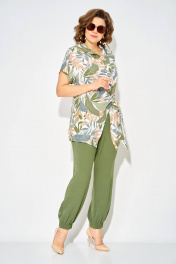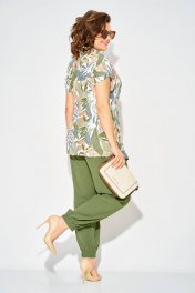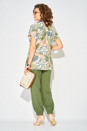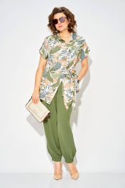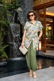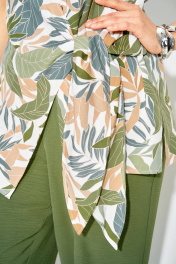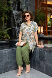 Стильный женский комплект для лета выполнен в современном стиле и отлично подходит для прогулки, отдыха дома или повседневных выходов. Образ состоит из двух частей: свободная хлопковая блузка и облегченные вискозные брюки «султанки». Блузка с тропическим принтом и ассиметричной декоративной завязкой по переду. Рукав цельнокроеный спущенный; воротник отложной на стойке, застежка центральная на пуговицы на притачной планке. В комплекте брюки свободного кроя со средней посадкой на притачном поясе с круговой резинкой, обеспечивают свободу движений и подчеркивают актуальный брючный тренд - по низу брюк. Яркий тропический дизайн блузки делает образ выразительным и молодежным. Ткань костюма дышащая и легкая, что особенно важно для летнего сезона. Блузон по спинке – 70 см, брюки – 98 см.