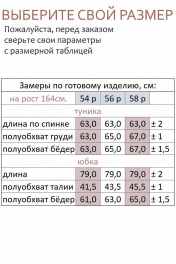 Трикотажный костюм женский, состоящий из туники и юбки на рост 164 см. Туника прямого силуэта среднего объема. Рукав длинный втачной рубашечного кроя, линия плеча спущена. Вырез горловины лодочка. Юбка прямого силуэта, удлинённая. Пояс на резинке, разрез в боковом шве.