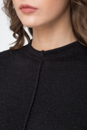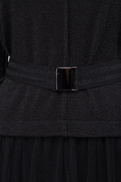 Нарядное трикотажное платье, имитация блузки и юбки. Вырез горловины -- небольшая цельнокроеная стойка. По центру вертикальный защип. Рукав втачной 3/4. Нижняя часть платья -- двойная юбка из трикотажного полотна с кружевом по низу, верх юбки из присборенного фатина. Платье украшено съёмным поясом из декоративной резинки с пряжкой. Длина (до низа фатина) -- 125,4см. ПОГ:48р-48см, 50р-50см, 52р-52см. ПОБ:48р-52,5см, 50р-54,5см, 52р-56,5см. Ширина на уровне подреза: 48р-49,3см, 50р-51,3см, 52р-53,3см.