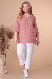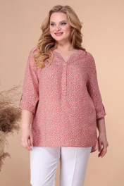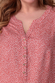 Летняя туника свободного кроя, выполненная из натурального штапеля с принтом. Линия плеча спущена. Рукав 3/4 на отворот с патой, фиксирующейся на пуговку. Вдоль выреза горловины планка с декоративными пуговками. Длина спинки--74см, ПОГ:54р-60,5см, 56р-62,5см, 58р-64,5см. ПОБ:54р-62см, 56р-64см, 58р-66см.
