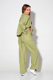 Жакет прямого силуэта со спущенной линией плеча. Воротник рубашечного типа. По переду накладные карманы с клапаном. Центральная застёжка на петли и пуговицы. По спинке настроченная кулиса со шнуром из основной ткани. Низ рукава на притачной манжете с застёжкой на петлю и пуговицу. Брюки на притачном поясе, от середины передних половинок и по спинке на резинке. Застежка брюк спереди по типу «гульфик». По бокам карманы с наклонным входом. Сзади накладные карманы. Комплект выполнен из хлопкового джинса. Длина брюк по боковому шву: 107 см. Длина куртки по центру спинки: 56 см. Длина рукава от горловины: 70 см.