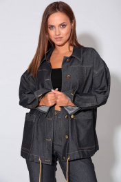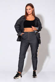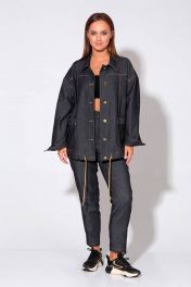 Комплект женский 2-х предметный: жакет и брюки. Комплект выполнен из хлопкового джинса. Куртка прямого силуэта, со спущенной линией плеча. Спереди центральная застежка на петли и пуговицы, по передним половинкам накладные карманы. Воротник стояче отложной. Низ рукава на притачной манжете, с застёжкой на петлю и пуговицу. По низу куртки вставлен шнур. Куртка без подкладки. Брюки на притачном поясе, на резинке, заужены к низу. Застежка брюк спереди по типу «гульфик». По бокам карманы с наклонным входом. Сзади накладные карманы. Длина брюк по боковому шву: 101 см. Длина жакета по центру спинки: 67 см. Длина рукава от горловины: 76 см
