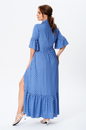 Платье длиной макси, выполнено из хлопковой ткани. Полочка платья с отрезной планкой по центру и застежкой на петли и пуговицы. Лиф платья отрезной, юбка со сборкой которая по низу обработана воланом. Рукав одно шовный, втачной. Низ рукава обработан воланом. Горловина обработана притачным воротником рубашечного типа, на стойке. В боковых швах обработаны карманы. Длина платья по середине спинки: 139см. Длина рукава: 34см.