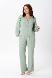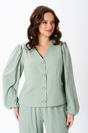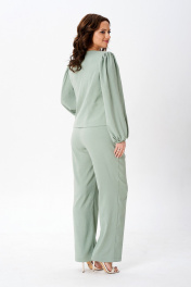 Жакет приталенного силуэта. V-образный вырез горловины, центральная застёжка на петли и пуговицы. Перед и спинка с вертикальными рельефами от плеча. Рукав втачной со сборкой в верхней части. По низу притачная манжета, собранная на резинку. Жакет частично на подкладке (перед и спинка). Брюки свободного кроя, на притачном поясе с эластичной тесьмой и потайным шнуром из основной ткани. В боковых швах карманы “ хулиганы”. Длина жакета по середине спинки: 54 см. Длина рукава: 64 см. Длина брюк по боковому шву с учётом пояса: 109 см.