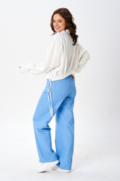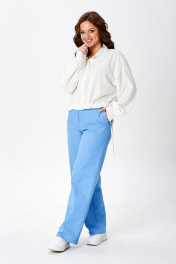 Блузка свободного кроя со спущенной линией плеча. Воротник рубашечного типа на отрезной стойке, центральная застёжка на петли и пуговицы. Низ блузки по спинке и переду собирается на кулису, которая может регулироваться по ширине. Рукав втачной, низ обработан притачной манжетой с застежкой на петлю и пуговицу Длина блузы по середине спинки: 46 см. Длина рукава с учетом плеча: 73 см.
