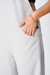 Комбинезон женский выполнен из смесовой ткани. Брюки комбинезона свободные, длина которых может регулироваться за счет поддерживающей паты на пуговицу. Застежка -пуговицы в боковом шве. Шлейки регулируют высоту комбинезона.