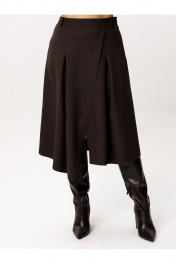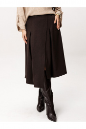 Юбка А-силуэта. По переду и по задней половинке встречные складки. Перед юбки ассиметричный. В боковой шов вставлена потайная молния. Верх юбки обработан притачным поясом со шлёвками, который застёгивается на петлю и пуговицу. Длина юбки по боковому шву: 73 см.