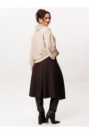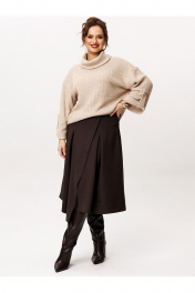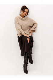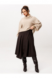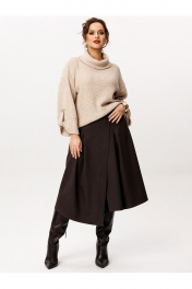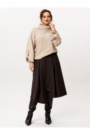 Джемпер изготовлен из вязаного трикотажа. Линия плеча спущена. Рукав длинный поддерживается патой на пуговицу. Воротник-хомут. Юбка А-силуэта. По переду и по задней половинке встречные складки. Перед юбки ассиметричный. В боковой шов вставлена потайная молния. Верх юбки обработан притачным поясом со шлёвками, который застёгивается на петлю и пуговицу. Длина джемпера по спинке: 60см. Длина юбки по боковому шву: 73см.