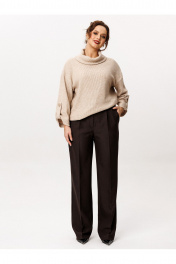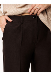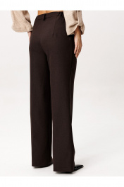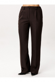 Брюки прямого кроя. На передних половинках небольшая складка, переходящая в стрелку. Верхний срез брюк обработан притачным поясом, по бокам вставлена резинка, имеются шлёвки под ремень. Застёжка брюк по типу «гульфик». В боковых швах карманы «хулиганы». На задних половинках брюк вытачки. Длина брюк по боковому шву с учётом пояса: 112 см.