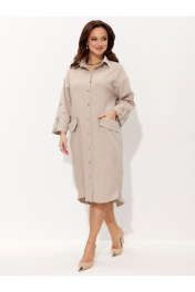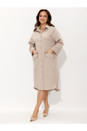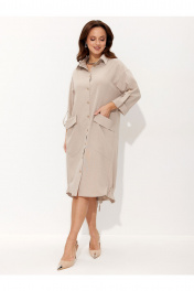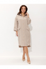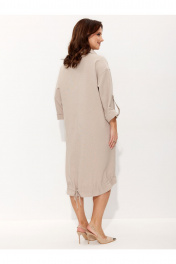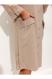 Платье свободного силуэта со спущенной линией плеча. Воротник рубашечного типа на стойке. Центральная застёжка на петли и пуговицы. По передним половинкам платья накладные карманы с цельнокроеным клапаном. Низ платья фигурный. Спинка платья чуть длиннее переда, по низу обработана обтачкой. Низ присборивается на шнур из основной ткани, таким образом формируя желаемый силуэт платья. Рукав двухшовный. Низ рукава на притачной манжете с патой. По верхнему центральному шву рукава пришиты две пуговицы, что позволяет регулировать длину рукава. Длина платья по середине спинке: 111 см. Длина рукава от горловины: 62 см.
