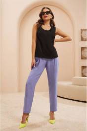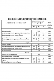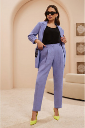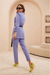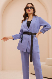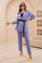 Костюм брючный Жакет со стояче – отложным воротником пиджачного типа и центральной застёжкой на петлю и пуговицу. Перед с накладными карманами в нижней части, и с настрочной тесьмой с вышивкой на одном кармане. Спинка со средним швом и двумя рельефами. Рукава втачные с резинкой по низу. На уровне талии съёмный пояс. Блуза с округлым вырезом горловины. Брюки на поясе с резинкой. Передние половинки с наклонными карманами к боковым швам и складками от пояса.