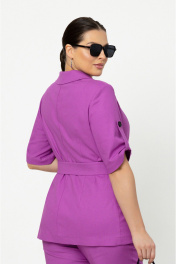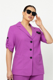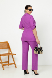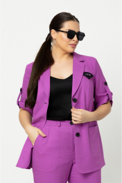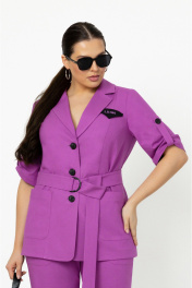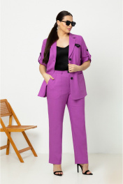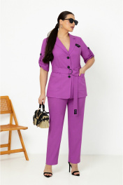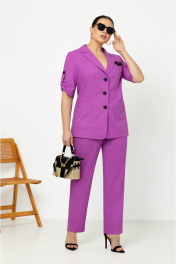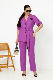 Жакет со стояче-отложным воротником пиджачного типа и центральной застёжкой на петли и пуговицы. Перед с накладными карманами в нижней части и декоративной листочкой с вышивкой в верхней части. Спинка со средним швом и талиевыми вытачками. Рукава втачные, с застёжкой на пату с пуговицей. На уровне талии съёмный пояс из ткани с вышивкой. Брюки на поясе с резинкой. Передние половинки с накладными карманами. ВОЗМОЖНА ЗАМЕНА ФУРНИТУРЫ НА АНАЛОГИЧНУЮ ТАКОГО ЖЕ КАЧЕСТВА.
