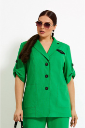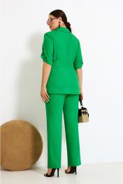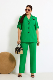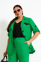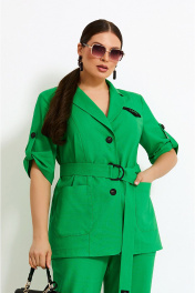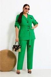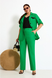 Жакет со стояче-отложным воротником пиджачного типа и центральной застёжкой на петли и пуговицы. Перед с накладными карманами в нижней части и декоративной листочкой с вышивкой в верхней части. Спинка со средним швом и талиевыми вытачками. Рукава втачные, с застёжкой на пату с пуговицей. На уровне талии съёмный пояс из ткани с вышивкой. Брюки на поясе с резинкой. Передние половинки с накладными карманами. ВОЗМОЖНА ЗАМЕНА ФУРНИТУРЫ НА АНАЛОГИЧНУЮ ТАКОГО ЖЕ КАЧЕСТВА.