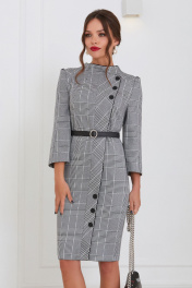 Платье с воротником - стойкой и съёмным ремнём по талии. Перед с декоративной деталью с пуговицами от среднего шва. Спинка с талиевыми вытачками, потайной молнией и шлицей в среднем шве. Рукава втачные.