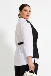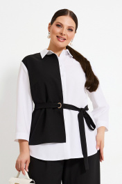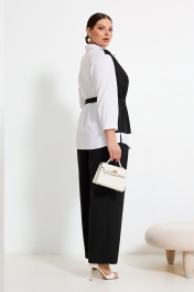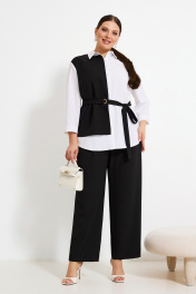 Блуза со стояче-отложным воротником и застёжкой на петли и пуговицы. Перед с деталью из контрастной ткани с одной стороны. Изделие со съёмным поясом по талии. Рукава втачные с манжетами по низу. Брюки на поясе с резинком. Передние половинки с наклонными карманами к боковым швам. Брюки со складками по переду от пояса. ВОЗМОЖНА ЗАМЕНА ФУРНИТУРЫ НА АНАЛОГИЧНУЮ ТАКОГО ЖЕ КАЧЕСТВА.