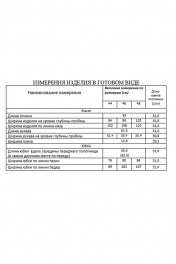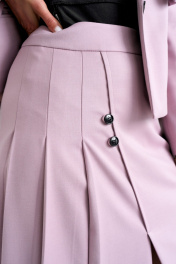 Жакет с центральной застёжкой на петлю с пуговицей и стояче-отложным воротником пиджачного типа. Изделие с отлетной кокеткой по переду и спинке. Перед с карманами в рамку в нижней части. Рукава втачные. Изделие на подкладке. Юбка на притачном поясе и фигурным низом по переду. Переднее полотнище частично со складками и декоративными пуговицами. Изделие с наклонным карманом к боковому шву с одной стороны. Заднее полотнище с потайной молнией в среднем шве. Юбка на подкладке.
