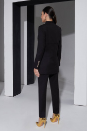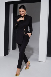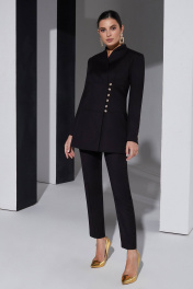 Дизайнерский брючный костюм со смещенной застежкой отличный выбор для ценителей минимализма и строгого стиля. Универсальный комплект впишется в любой гардероб и подойдет на все случаи жизни, подходит для шпилек и обуви на плоском ходу. Вещи из этой ми капсулы легко сочетать с другими вещами, базовые черные брюки отлично будут смотреться с белой рубашкой, а удлиненный жакет можно носить как легкий плащ с платьем или юбкой. Удлиненный жакет с цельнокроеной стойкой и смещенной застежкой, застегивается на воздушные навесные петли. Перед и спинка с подрезами ниже груди и талии оформлены декоративными отстрочками. Рукав втачной с отлетной шлицей. Базовые брюки с косыми карманами заужены к низу. Застежка обработана по классической технологии (гульфик с молнией и пуговица на поясе). Вся обработка выполнена как в классических итальянских костюмах. Жакет на подкладке. На обтачке спинки жакета выполнена аккуратная вышивка. ВОЗМОЖНА ЗАМЕНА ФУРНИТУРЫ НА АНАЛОГИЧНУЮ ТАКОГО ЖЕ КАЧЕСТВА.