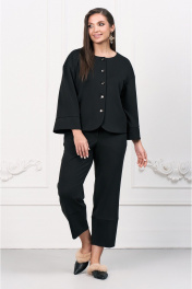 Костюм брючный Жакет со спущенной линией плеча, округлым вырезом горловины и центральной застёжкой на петли и пуговицы. Спинка с отрезной деталью в нижней части. Рукава втачные с манжетами по низу. Жакет на подкладке. Брюки на притачном поясе с резинкой и отрезными деталями (высокими манжетами) в нижней части. Передние половинки с наклонными карманами к боковым швам. ВОЗМОЖНА ЗАМЕНА ФУРНИТУРЫ НА АНАЛОГИЧНУЮ ТАКОГО ЖЕ КАЧЕСТВА.