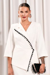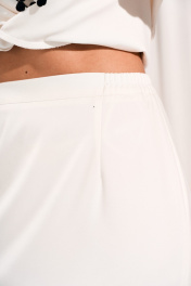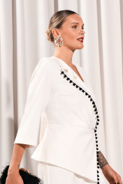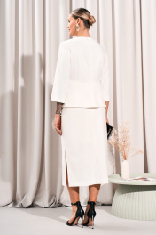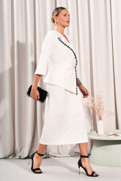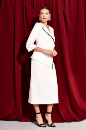 Блуза с V- образным вырезом горловины, фигурным низом и баской. Перед с брошью на лацкане и пришивным декором по краю. Спинка с потайной молнией в среднем шве и талиевыми вытачками до баски. Рукава втачные. Юбка на поясе с резинкой и разрезом по боковому шву. Заднее полотнище с потайной молнией в среднем шве. Юбка на подкладке. ВОЗМОЖНА ЗАМЕНА ФУРНИТУРЫ НА АНАЛОГИЧНУЮ ТАКОГО ЖЕ КАЧЕСТВА.