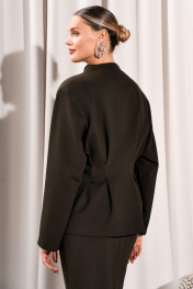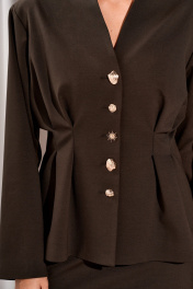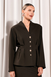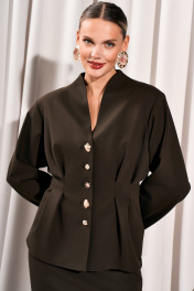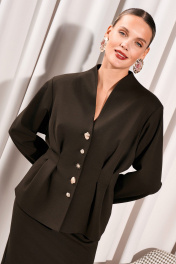 Костюм юбочный Жакет имеет современный силуэт: чуть расширенная линия плеча и более облегающий в районе талии. Изделие с цельнокроеной стойкой. По переду и спинке жакет застрочен по талии. Спинка со средним швом. Акцент изделия - это дизайнерские пуговицы. Каждая пуговица имеет свой оригинальный вид, объединяясь золотым цветом, создаётся современное уникальное сочетание. Рукава втачные. Жакет на подкладке. Юбка на поясе с резинкой. Заднее полотнище с потайной молнией и шлицей в среднем шве. Юбка на подкладке.